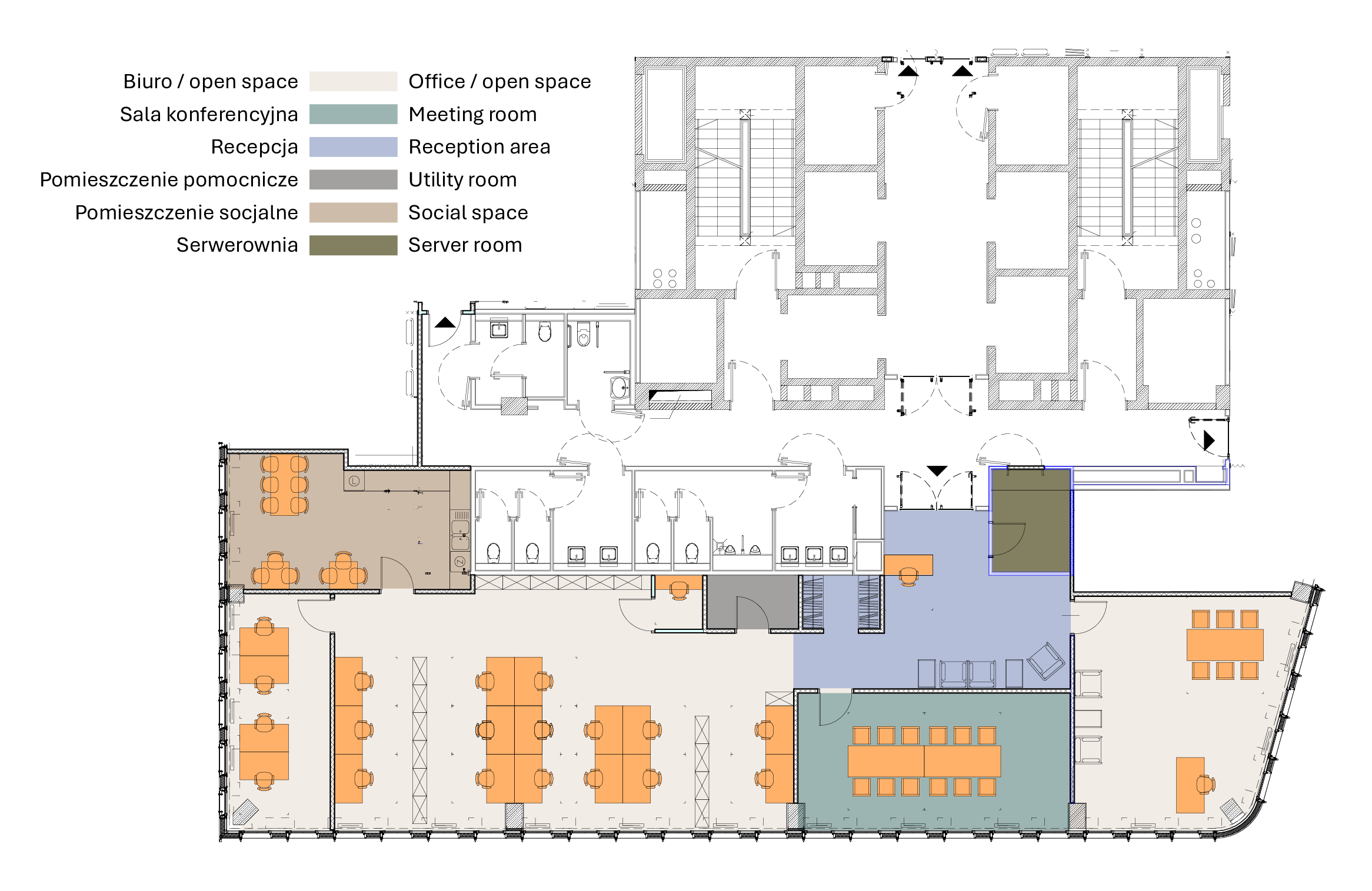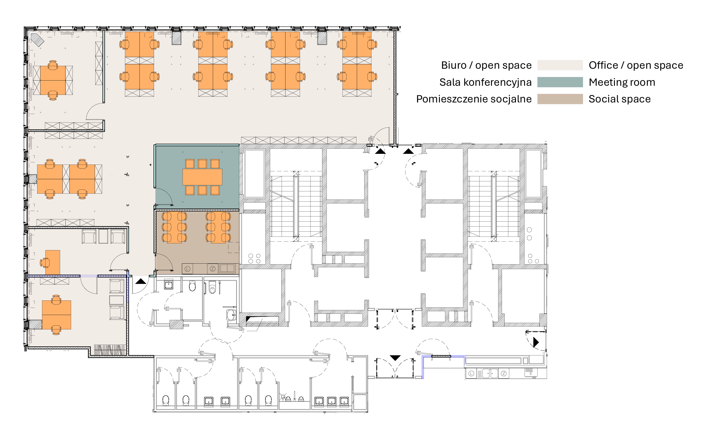 Ważny element koncepcji stanowią pasaże z ogólnodostępnym skwerem oraz architektura krajobrazu podkreślająca poszczególne strefy funkcjonalne. W tworzeniu przestrzeni publicznej wykorzystano klasyczne elementy budujące tzw. „miękkie granice”, jak arkady czy pergole, dzięki czemu nie odcina się ona od otoczenia. Publiczny, a zarazem kameralny charakter wnętrz urbanistycznych cechuje ludzka skala, sprzyjająca tworzeniu dobrej atmosfery i „życia między budynkami”.